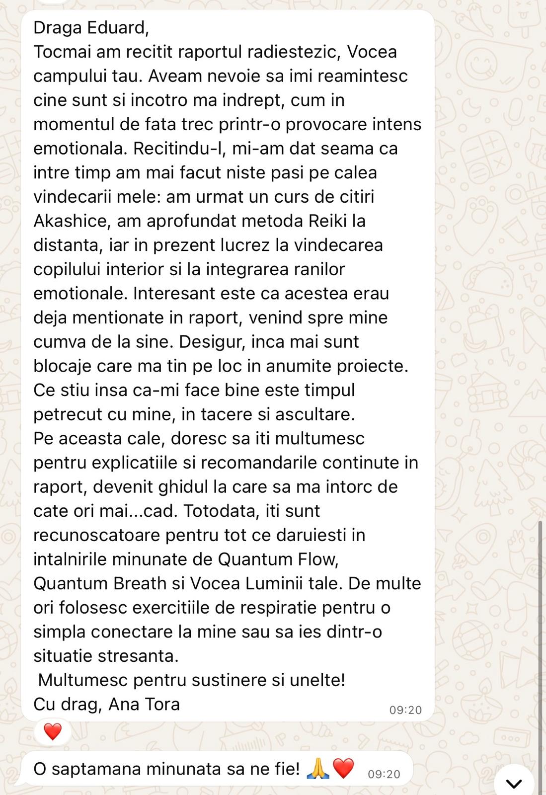 Este mai mult decât o sesiune. Este o reîntâlnire cu frecvența ta reală.Acest serviciu 1-la-1 integrează două instrumente de transformare profundă: 🔹 Radiestezia – știința subtilă care permite măsurarea parametrilor energetici ai ființei tale: vibrație, vitalitate, congestii, influențe externe, echilibru interior; 🔹 Quantum Breath – o metodă inovatoare de activare energetică prin respirație conștientă și prezență deplină, care integrează schimbarea la nivel celular, mental și spiritual.🌌 În această fuziune, nu doar afli unde te afli – ci și primești exact energia de care ai nevoie ca să te realiniezi. Este vocea câmpului tău, lasă-te ghidează.Procesul Vocea Câmpului Tău are loc în doi pași:🔹 Pasul 1 – eu fac măsurătorile radiestezice ale câmpului tău energetic, separat 🔹 Pasul 2 – ne întâlnim 1-la-1 pentru interpretarea măsurătorilor și o sesiune de Quantum Breath, pentru reglare și stabilizareAi mai jos variantele disponibile, în funcție de profunzimea dorită:🌿 Planuri disponibile